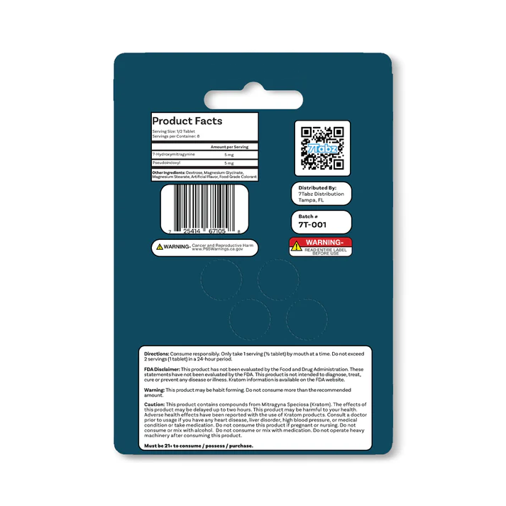 Our 7-OH + Pseudo blend tablets each contain 10mg of 7-OH and 10mg of Pseudo extracted from organic Kratom leaf.